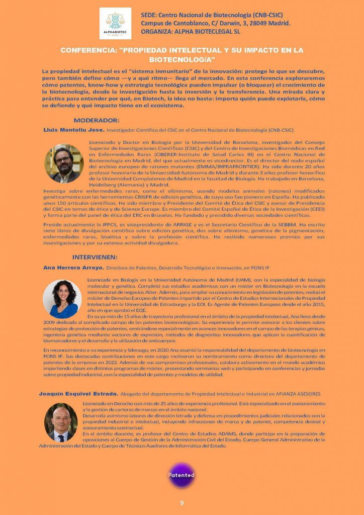 𝗣𝗿𝗼𝗽𝗶𝗲𝗱𝗮𝗱 𝗜𝗻𝘁𝗲𝗹𝗲𝗰𝘁𝘂𝗮𝗹 𝘆 𝗕𝗶𝗼𝘁𝗲𝗰𝗻𝗼𝗹𝗼𝗴í𝗮 moderada por Lluis Montoliu con Ana Herrera y Joaquin Esquivel: patentes, protección y ventaja competitiva… con los pies en la realidad del sector.